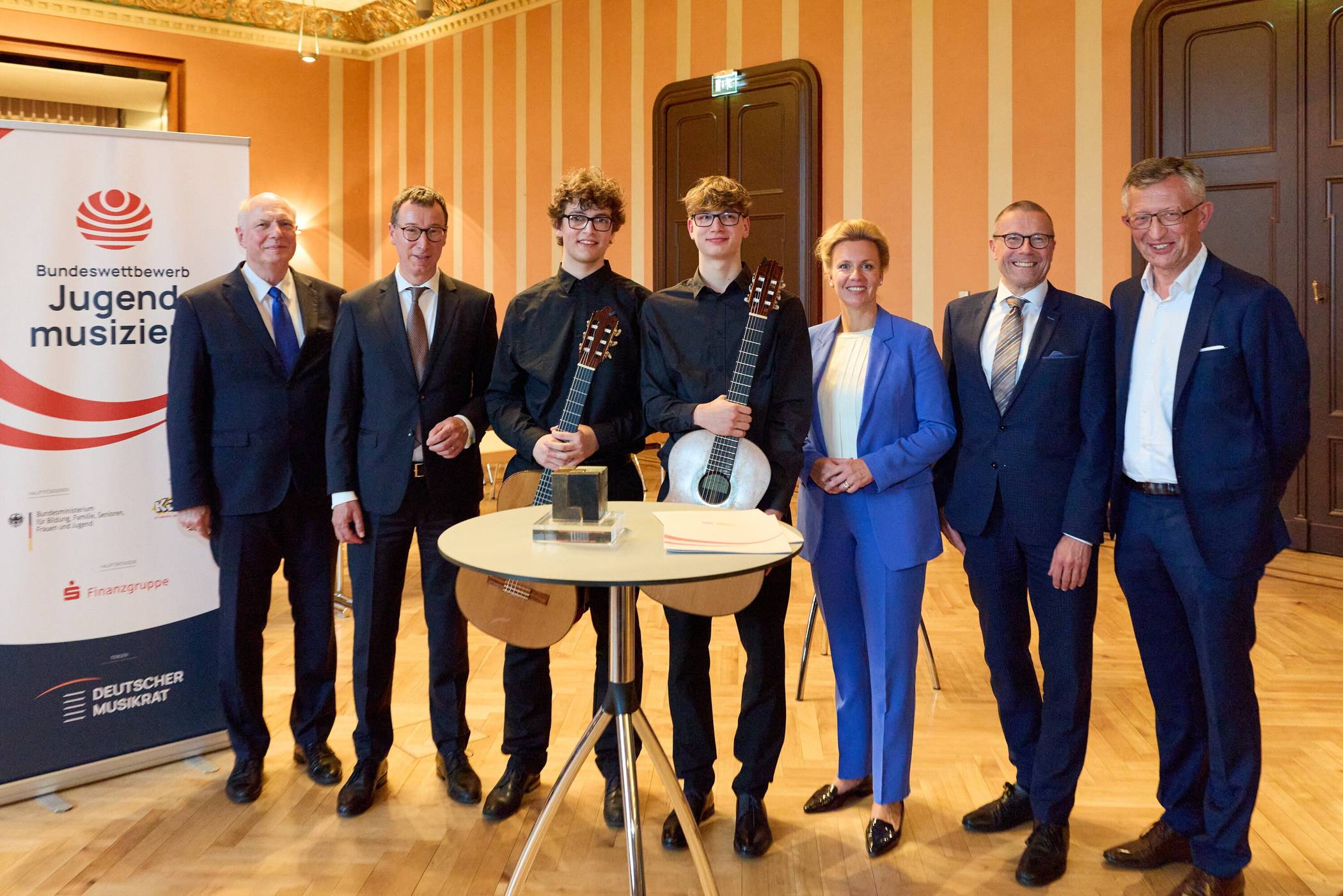 Von li.: Prof. Martin Maria Krüger (Präsident DMR), Axel Jütz (Vorstandsvorsitzender StadtSparkasse Wuppertal), Valentin Leonhard Pommée, Kilian Thomas Pommée, Ina Brandes (Ministerin für Kultur und Wissenschaft des Landes Nordrhein-Westfalen), Uwe Schneidewind (Oberbürgermeister der Stadt Wuppertal) und Matthias Nocke (Kulturdezernent der Stadt Wuppertal).