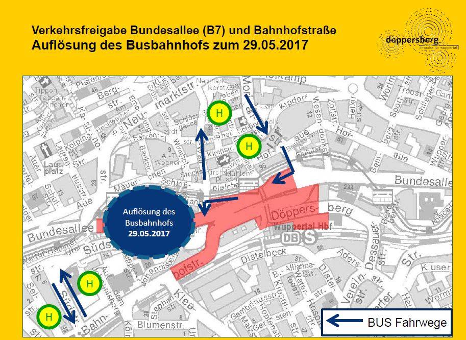 Bereits Ende Mai zieht der Busbahnhof von der B7 weg und verteilt sich in Elberfeld. "Der Platz am Kolk wird dabei eine wichtige Funktion übernehmen. Außerdem müssen viele Änderungen an Kreuzungen, Ampelschaltungen und Fahrbeziehungen zurückgebaut werden, die für die Sperrung notwendig waren", so die Verwaltung.