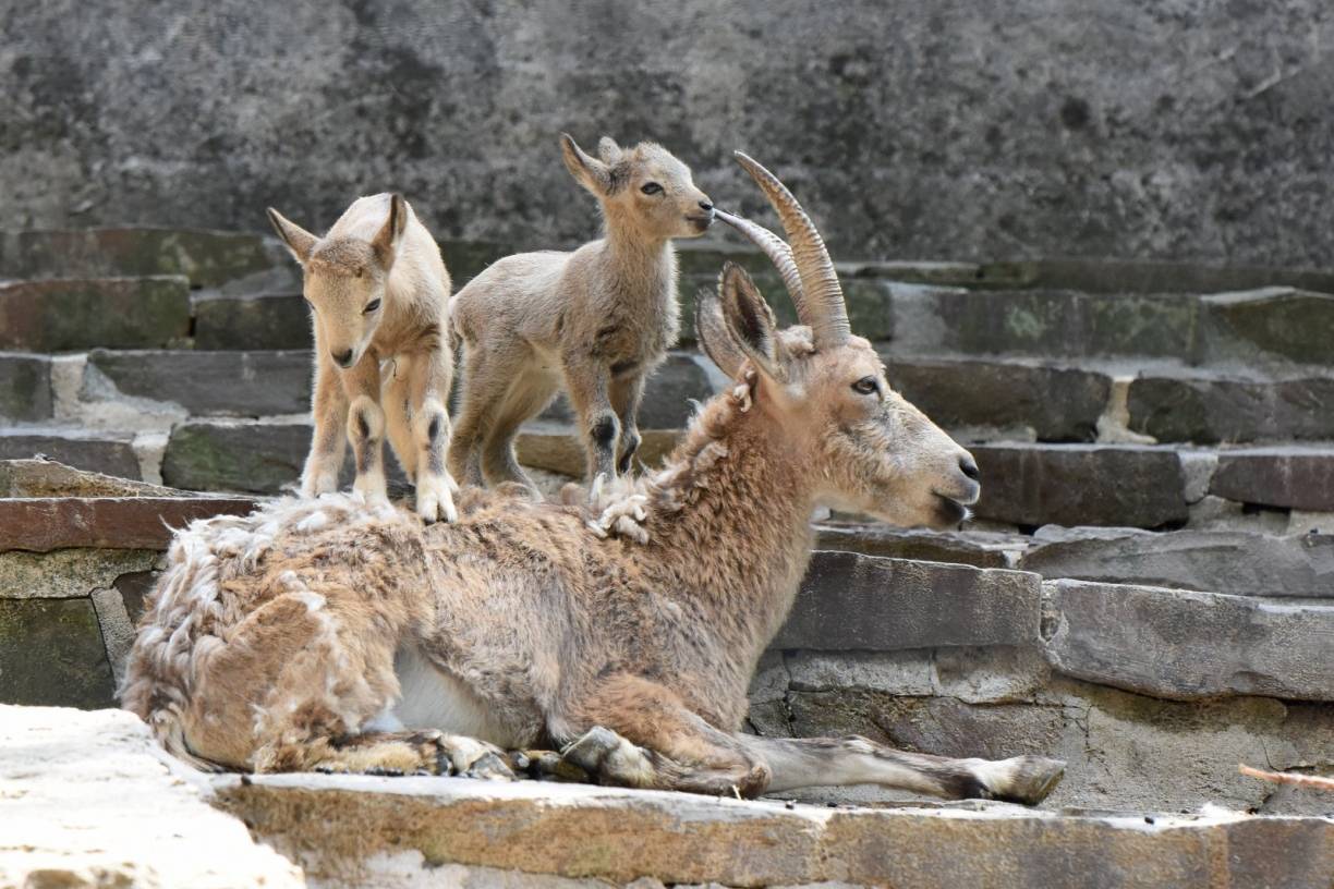 Weiteren Nachwuchs hat es auch bei den Sibirischen Steinböcken gegeben, die den Steinbockfelsen des historischen Nordlandpanoramas im Grünen Zoo bewohnen. Bereits am 11. Mai waren hier Zwillinge zur Welt gekommen. Am 31. Mai kam noch ein kleines Steinbock-Weibchen zur Welt, am 22. Juni folgte ein männliches Jungtier. Wie ihre Eltern können die kleinen Steinböcke bereits gut klettern und bewegen sich geschickt auf der felsigen Anlage.