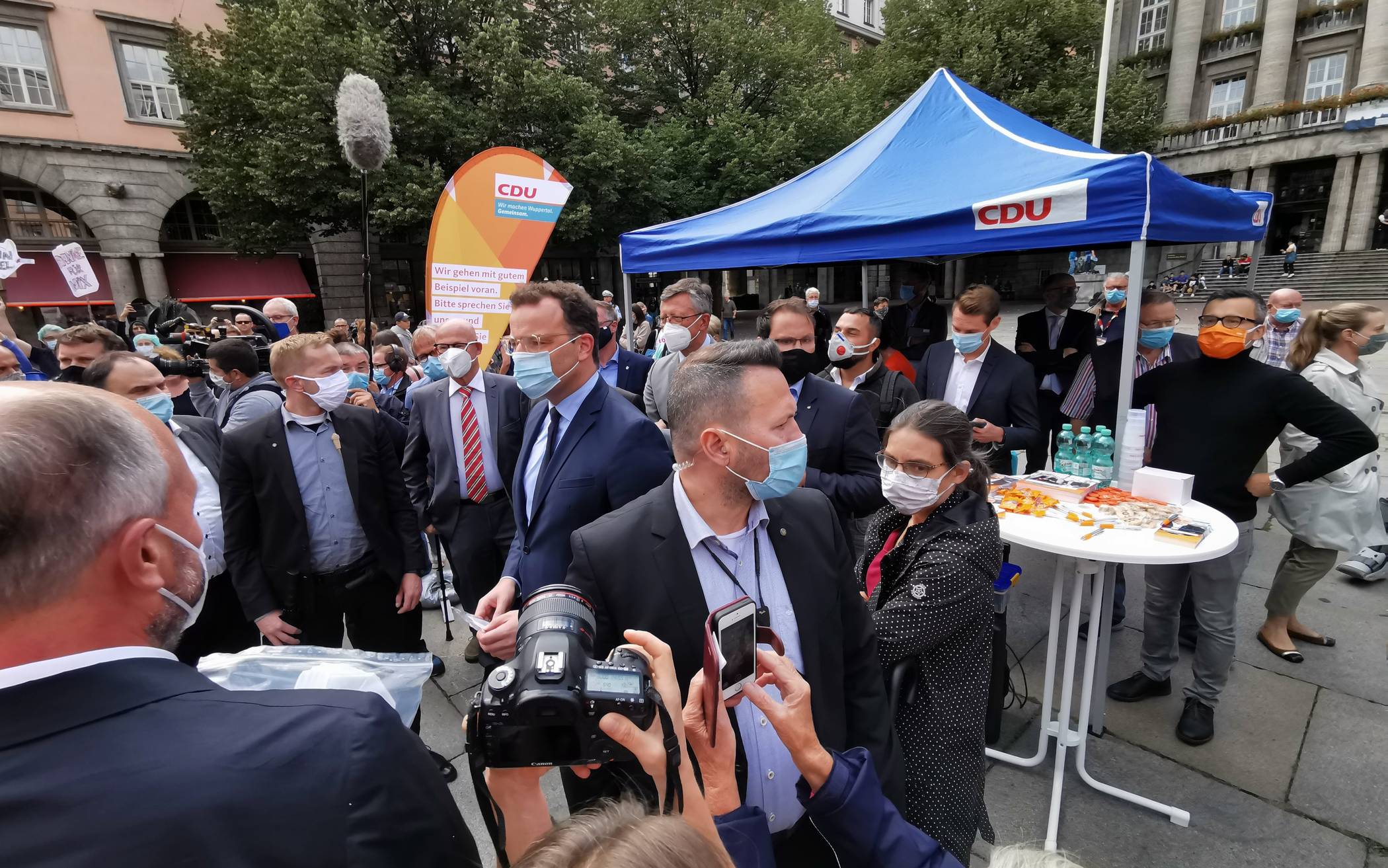 Bundesgesundheitsminister Jens Spahn besuchte am Montag, 24. August 2020, den CDU Info-Stand auf dem Johannes-Rau-Platz in Wuppertal-Barmen. Dort stellte er sich den Fragen der Wuppertalerinnen und Wuppertaler. Mit einer Verspätung von rund einer halben Stunde wurde der Politiker mit Buhrufen und Pfiffen empfangen. Die geplanten Fragen und Gespräche gestalteten sich wegen der Lautstärke (Trommeln, Trillerpfeifen und Rufe) schwierig. Nach rund einer halben Stunde verließ Spahn gemeinsam mit Vertreten der Wuppertaler CDU den Rathaus-Platz uns zog sich für Gespräche in die nahegelegene CDU-Kreisgeschäftsstelle an der Lindenstraße zurück.