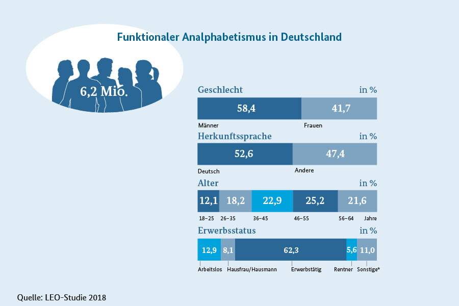 Jeder achte Erwachsene in Deutschland kann zwar Wörter und einzelne Sätze lesen und schreiben, hat jedoch Mühe, einen längeren zusammenhängenden Text zu verstehen. Das sind laut Leo-Studie der Universität Hamburg bundesweit 6,2 Millionen Menschen.