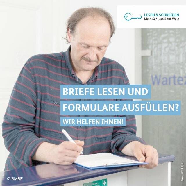 Teil der Ausstellung sind auch Poster der Kampagne „Lesen & Schreiben - Mein Schlüssel zu Welt“ des Bundesministeriums für Bildung und Forschung. Sie zeigen Erwachsene in verschiedenen Alltagssituationen und heben die Vorteile des besseren Lesens und Schreibens für den Alltag hervor.