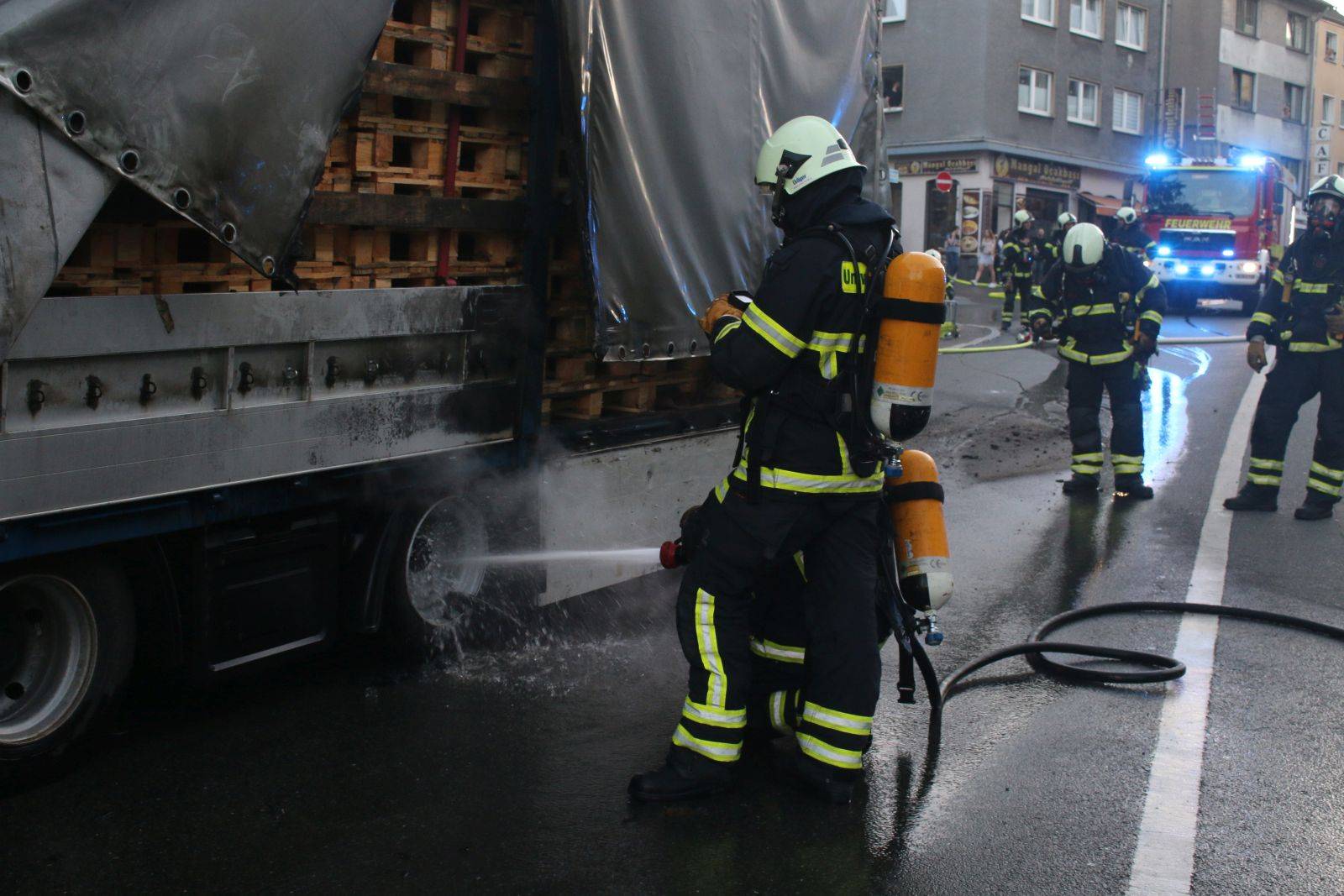 Der LKW war durch heiß gefahrene Bremsen in Brand geraten.