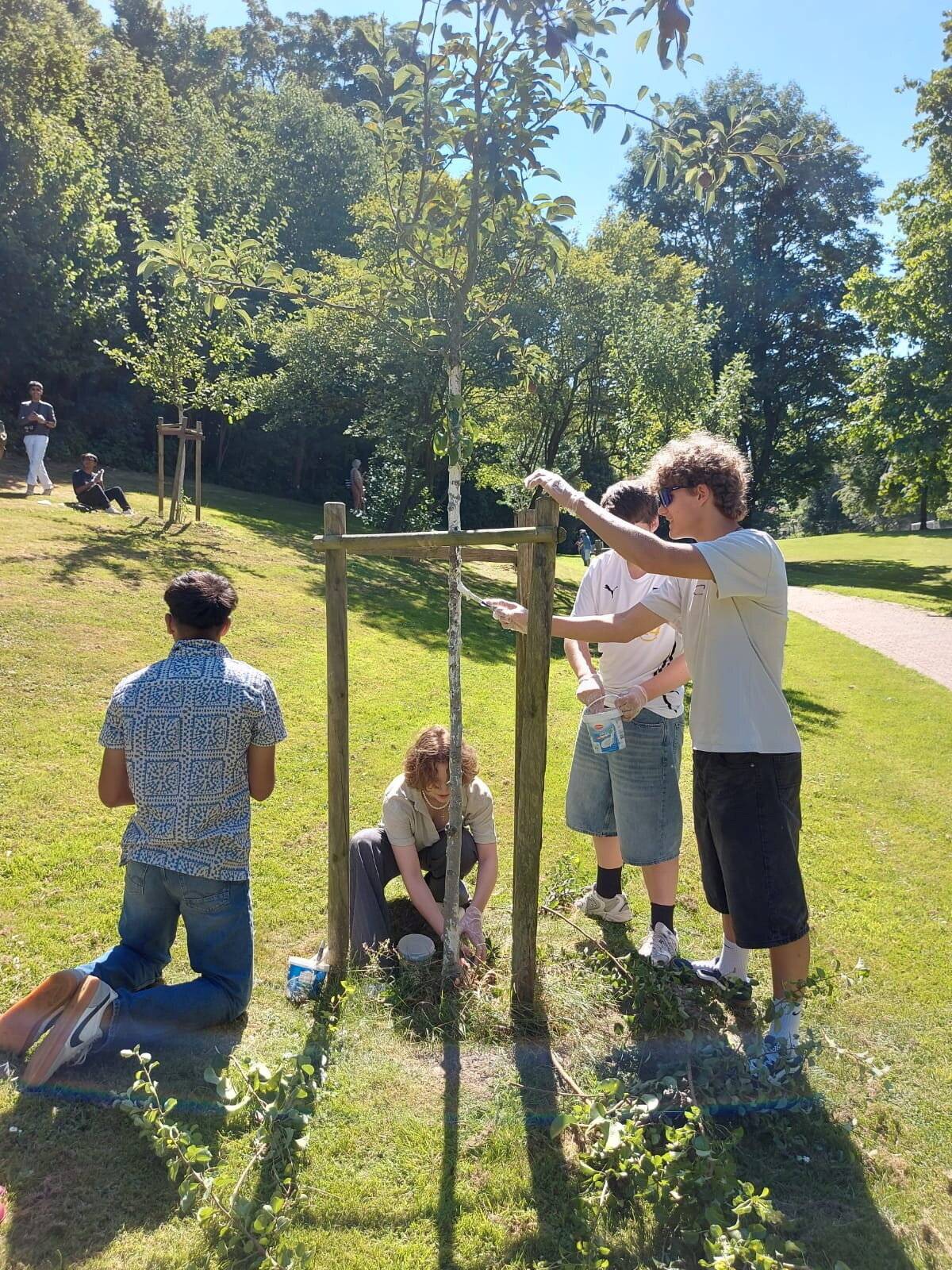 „Es war zwar sehr heiß, aber die Stimmung war klasse. Alle haben tatkräftig angepackt“, so Iris Koall vom „Team talbuddeln“. Auf dem Programm standen unter anderem ein Kalkanstrich für die Obstbäume, der die Rinde vor Sonnenbrand und Rissen schützt, sowie das Erneuern von Anbindungen, damit die jungen Bäume stabil weiter wachsen können.