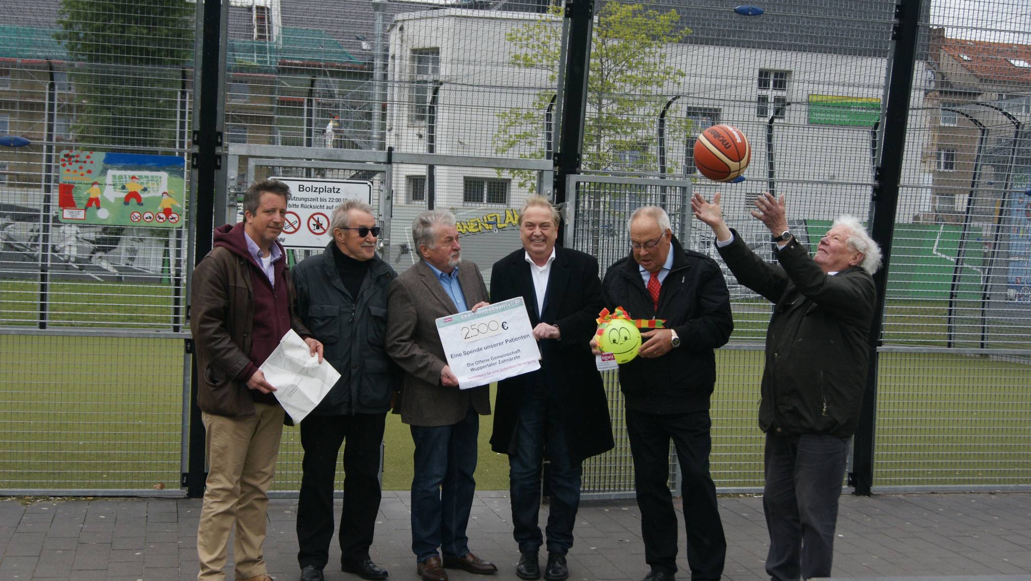 International sind die Trikots – wie die Sportler auch. Nach Erkenntnissen des ehrenamtlichen Platzpaten und der Stadt gab es bisher in viereinhalb Jahren keine Probleme. Wenn die Kids turniermäßig die Spiele austragen, entstehen Wartezeiten. Die können in naher Zukunft auch sportlich überbrückt werden: Die offene Gemeinschaft der Wuppertaler Zahnärzte, in der 80 Mitglieder soziale Projekte fördern, spendete für die Anlage einen Streetball-Korb im Wert von 2.500 Euro. Wilfried Klein und Heinz Willi Riedesel vom Unterbarmer Bürgerverein sowie Bezirksbürgermeister Hans-Hermann Lücke freuten sich über die private Initiative. Ideengeber Dr. Dirk Specht, der seine Jugend in Unterbarmen verbracht hat, war überrascht über das kleine „Unterbarmer Stadion“ in unmittelbarer Nähe seiner Praxis, das er bisher noch gar nicht bewusst wahrgenommen hatte.