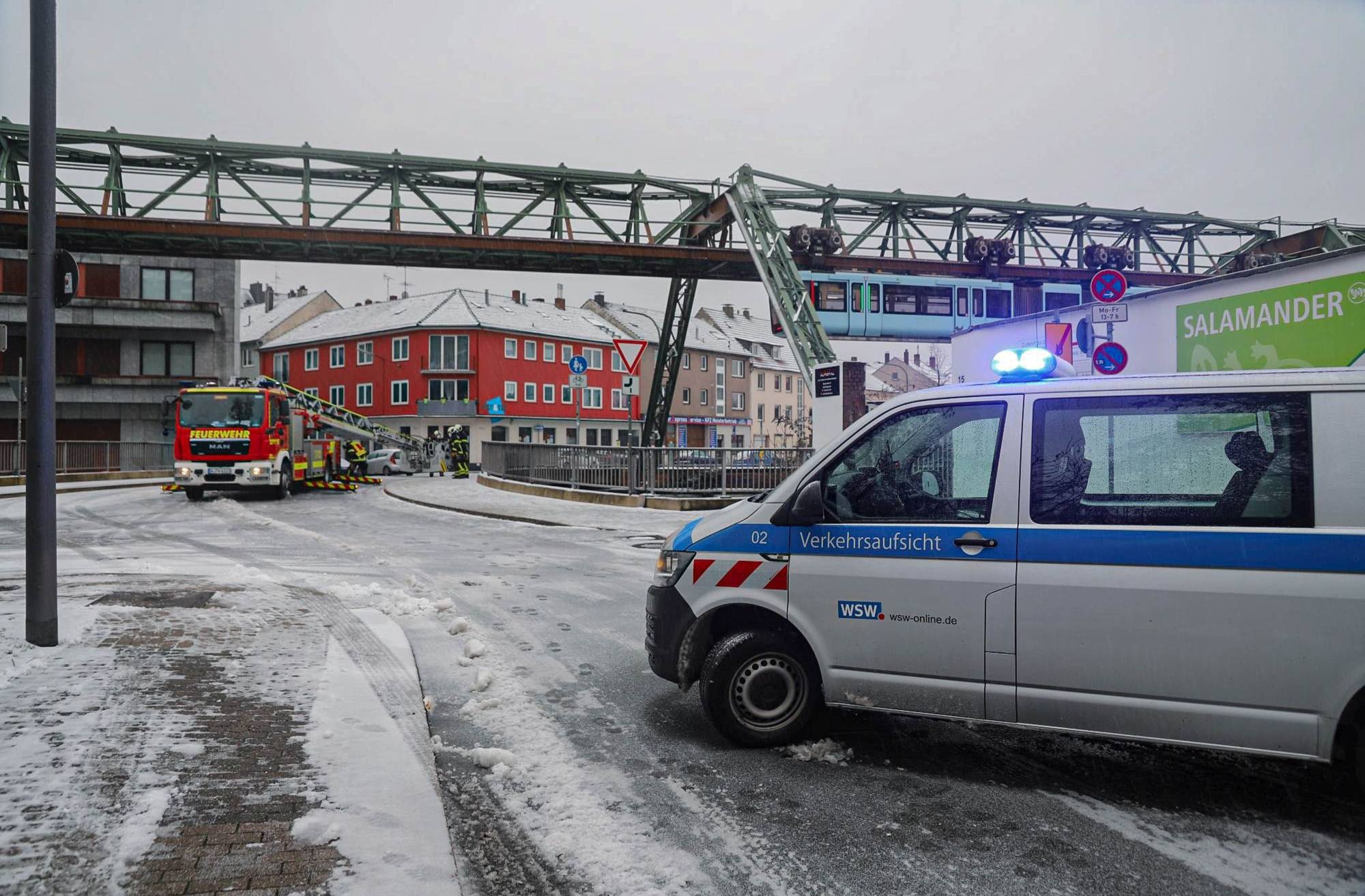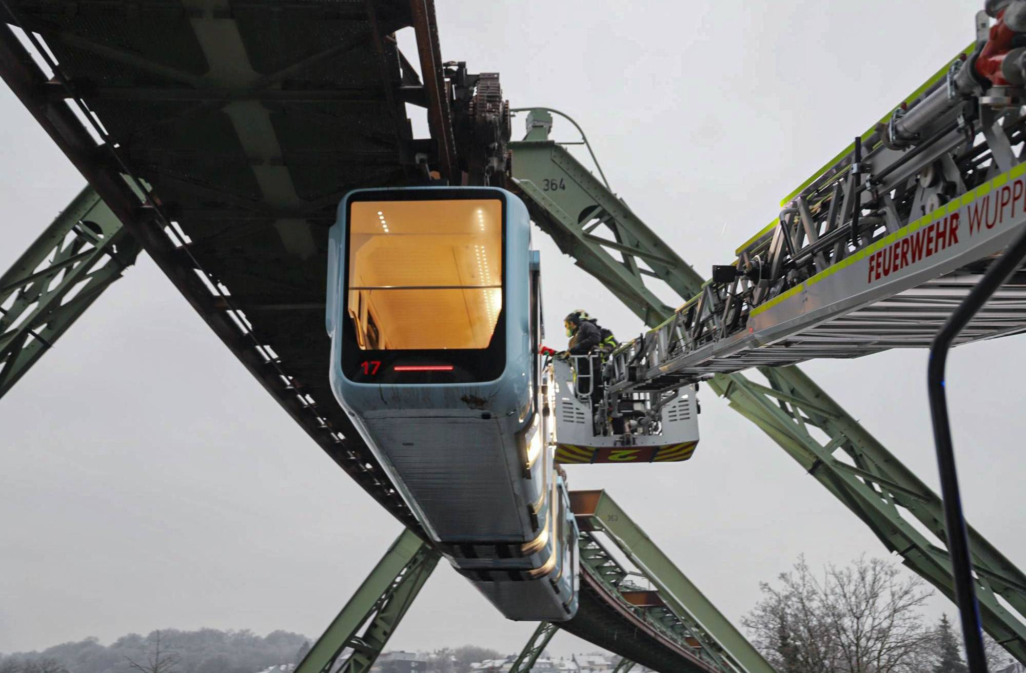 Bilderstrecke Schwebebahn per Drehleiter verlassen