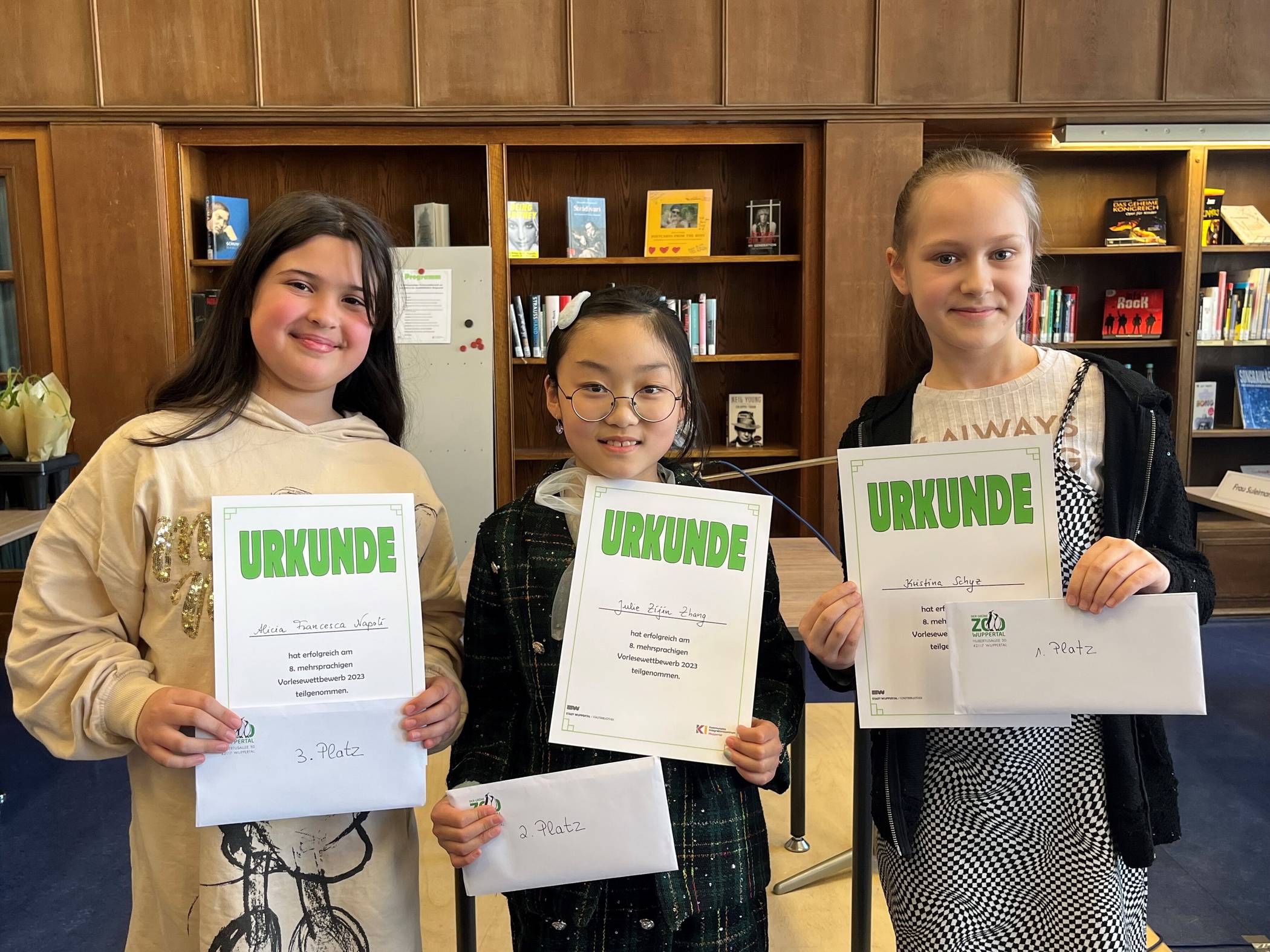 Als die drei besten Vorleserinnen und Vorleser beim diesjährigen Wettbewerb konnten Kristina Schyz (russisch, 1. Platz), Julie Zijin Zhang (chinesisch, 2. Platz) und Alicia Napoli (italienisch 3. Platz) die Jury mit ihrem besonders lebendigen Vortrag am meisten überzeugen und sich über die Auszeichnung freuen. Nach Abschluss des Wettbewerbs bekamen alle acht Teilnehmerinnen und Teilnehmer ein Buch geschenkt. Die drei Gewinnerinnen und Gewinner konnten sich zudem über Freikarten für die ganze Familie für den Grünen Zoo Wuppertal freuen.