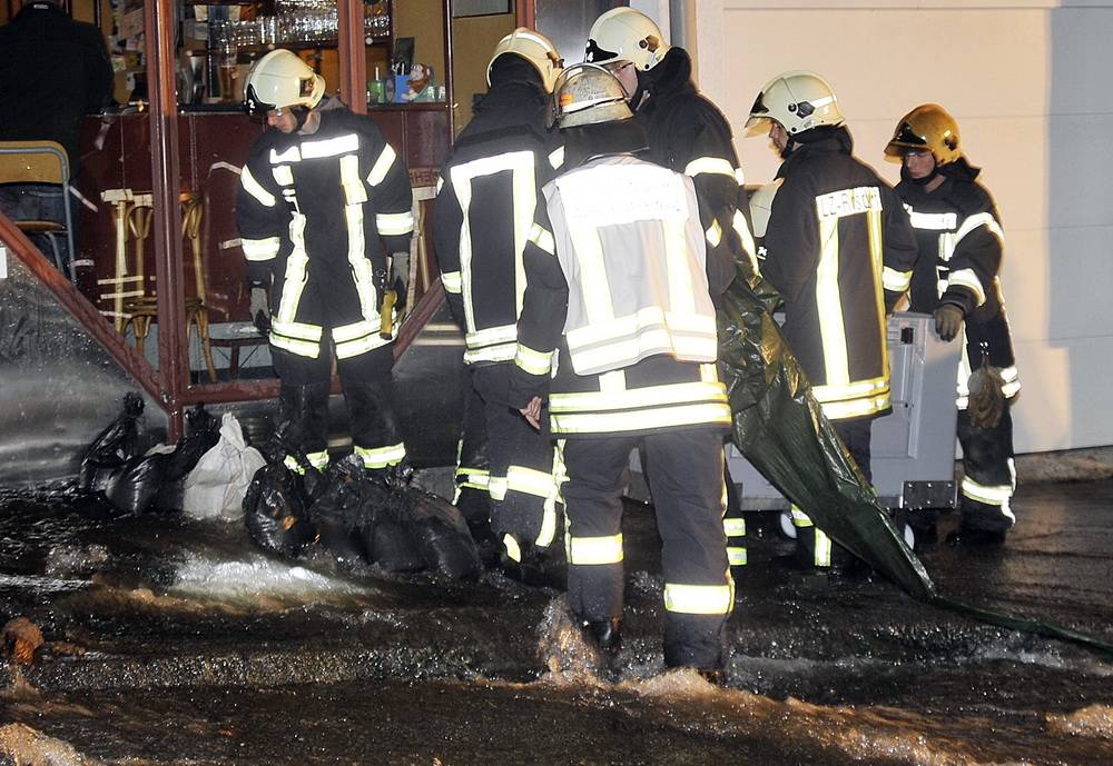 Die Feuerwehr war kurz vor 21 Uhr informiert worden. Durch den Druck wurden Steine, Sand und Platten weggespült. Die Einsatzkräfte verteilten Sandsäcke, um zu verhindern, dass das Wasser in eine Kneipe drang.