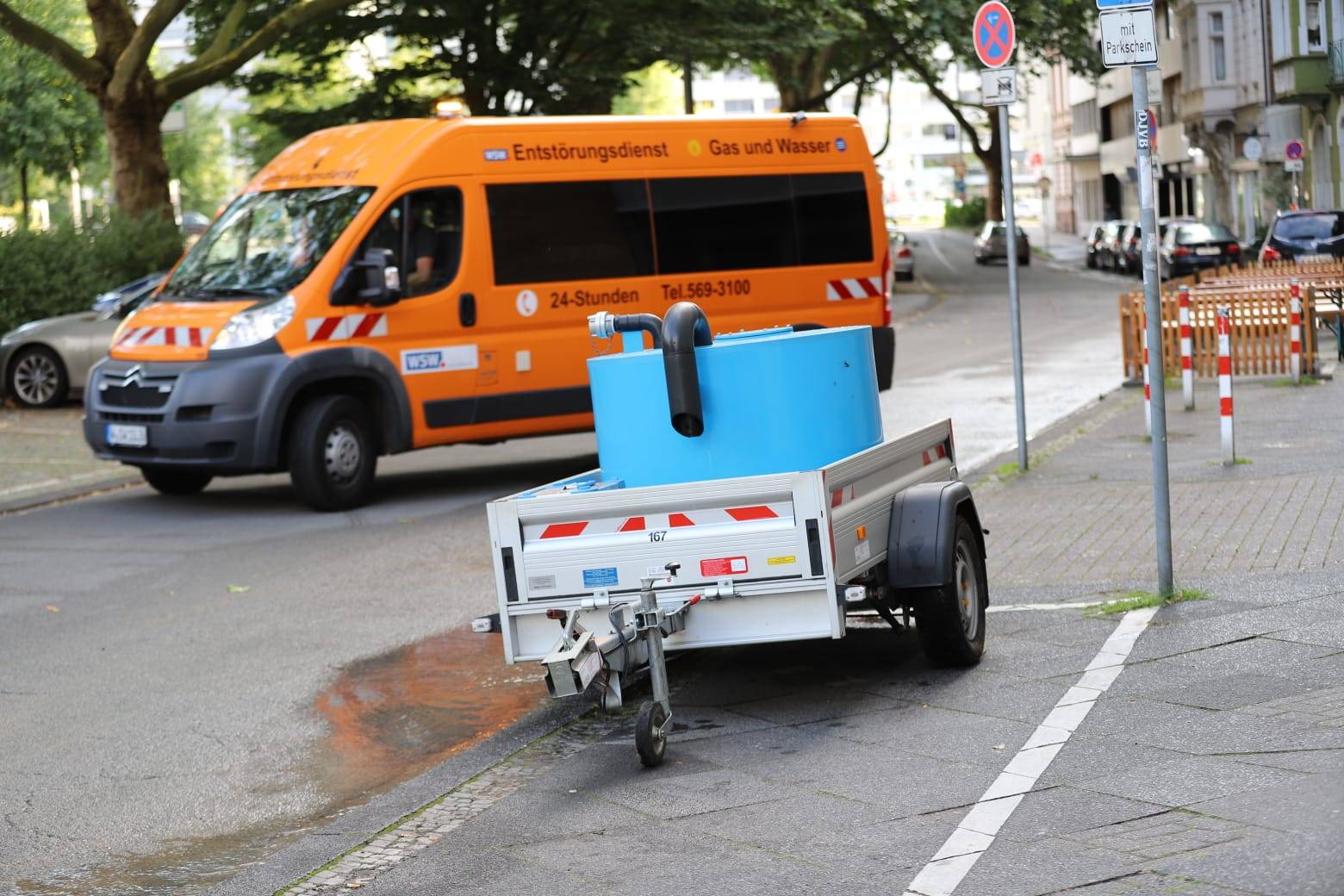 In der Elberfelder Aue ist am Sonntag (26. Juli 2020) ein Wasserrohr gebrochen. Die Stadtwerke (WSW) haben die Versorgung eingestellt, gleichzeitig aber für die Anwohnerinnen und Anwohner zwei Behälter mit Trinkwasser aufgestellt.