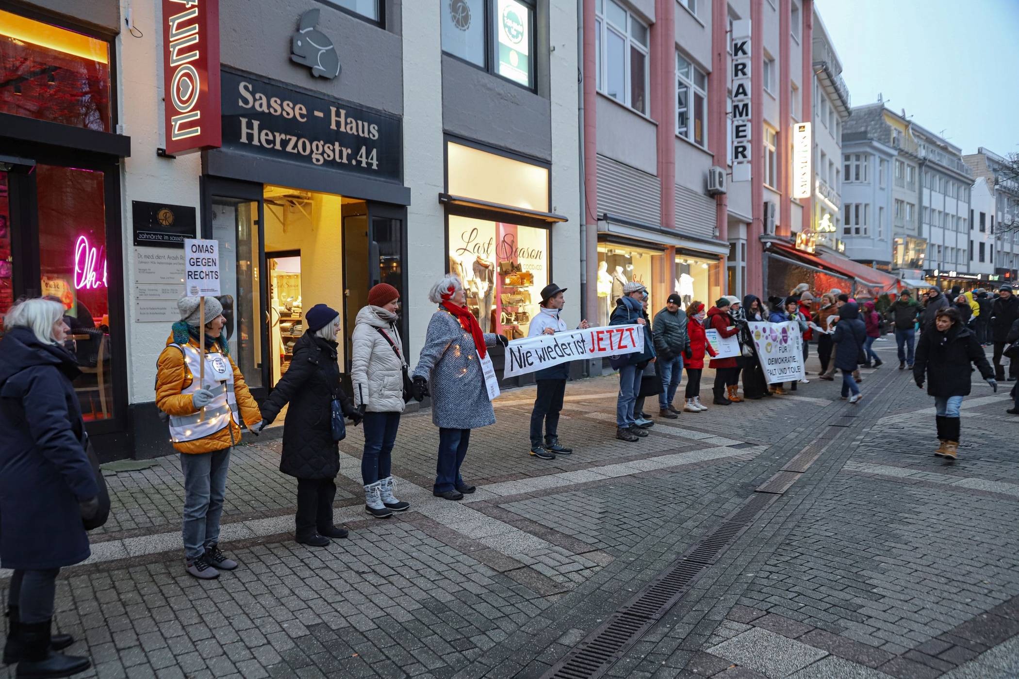 Sie bildeten in Anwesenheit von Oberbürgermeister Prof. Uwe Schneidewind innerstädtisch eine Menschenkette. Auf Anfrage der Rundschau bestätigte die Polizei, dass in der Spitze sich rund 500 Bürgerinnen und Bürger an der Aktion beteiligt haben. Die „Omas gegen Rechts“ hatten im Vorfeld gemeinsam mit anderen Initiativen einen Aufruf veröffentlicht. Der Wortlaut: hier klicken!