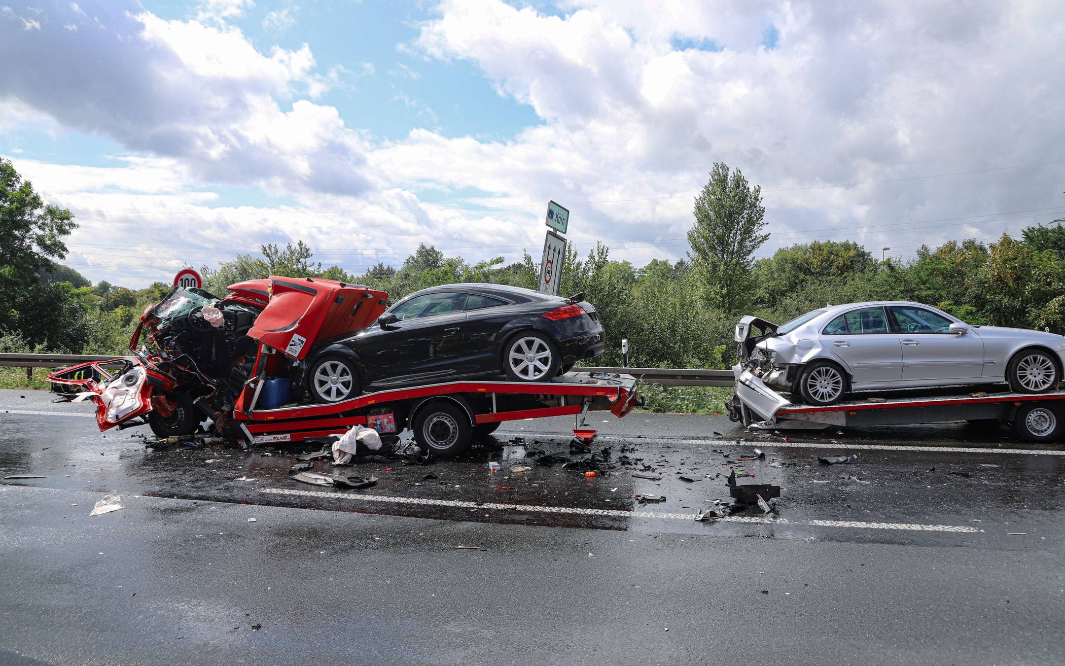 Nach ersten Ermittlungen der Polizei war ein Mann gegen 14 Uhr mit seinem in Polen zugelassenen Fahrzeugtransporter auf regennasser Fahrbahn auf einen 40-Tonner aufgefahren. Möglicherweise hatte er zu spät erkannt, dass der Lkw vor der Baustelle, wo die Geschwindigkeit noch einmal reduziert wird, abbremste. Kurz danach prallte ein Pkw mit belgischem Kennzeichen gegen den Fahrzeugtransporter.