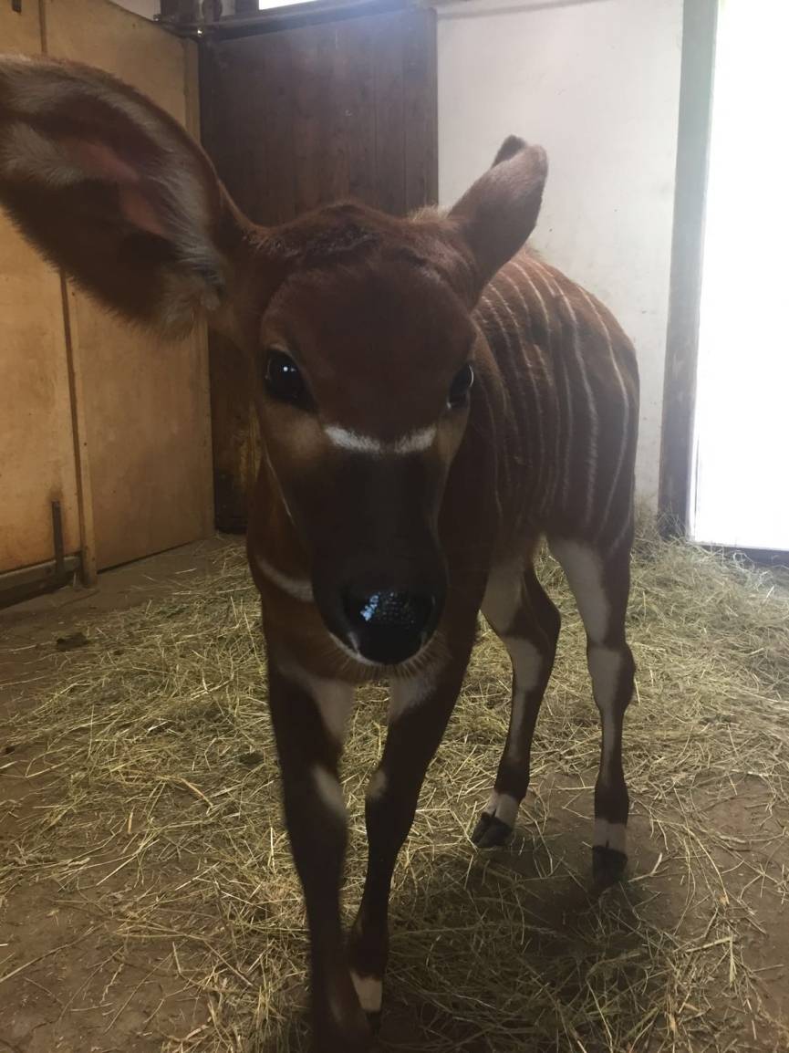 "Die stark bedrohten Bongo-Antilopen stammen aus Kenia und fallen dem Zoobesuchern sowohl durch ihre rotbraune Färbung als auch durch die stark geschwungen Hörner auf", erklärt